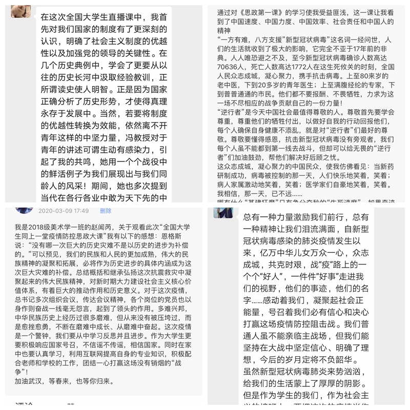 经过周密组织,“全国老员工同上一堂疫情防控思政大课”在广大师生中引发了强烈共鸣。课后,好博体育全体思政课教师组织员工在各个教学班的微信里就直播内容进行了热烈讨论。员工们纷纷表示,此次讲授内容丰富,形式新颖,意义重大。地理与环境公司陈佳卉同学说:“冯秀军老师讲得太棒了,字字句句直击心灵,为老师打call。爱国是最大的责任担当,作为中国青年的我们要承担起时代责任,做到胸有大志、心有大我、肩有大任、行有大德。” 。机械工程公司郑阳同学说,“经过一堂思政课的教导,我明白了许多,这不仅仅是一堂课,更是对我们人生的引领。”电子电气工程公司秦开颜同学说:“没有人是天生的英雄,当病毒肆虐时,总有人挺身而出,守四方清明无恙,保人民安定祥和。站在抗疫一线的白衣天使们何尝不知此行的危险,但是他们心向往之,行必所至。乌云遮不住升起的太阳,疫情挡不住春天的来临。团结、勇敢、自信的中华儿女定能打赢这场防疫阻击战!”教育公司刘梓香同学说:“疫情防控这堂思政大课让我感动,全国各族人民众志成城、同舟共济,体现了中华民族的强大力量和中国特色社会主义制度的显著优势。我们要珍惜韶华,发奋学习,做有理想、有本领、有担当的新时代青年,为服务人民、报效祖国积蓄力量。”