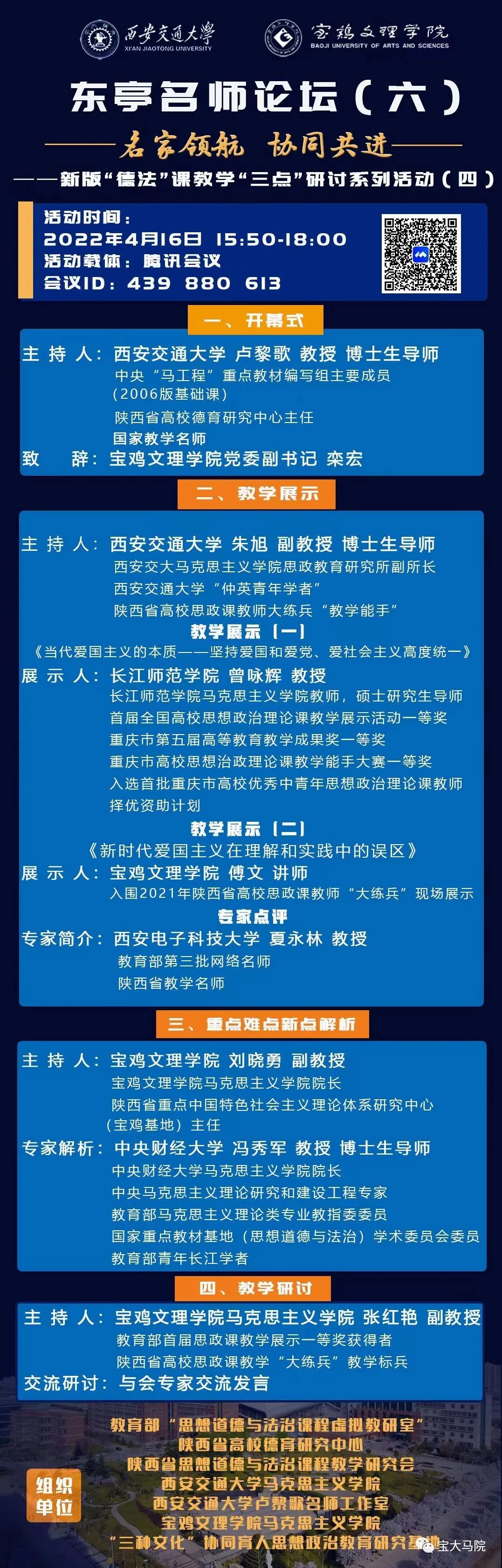 4月16日,由教育部“思想道德与法治虚拟教研室”、陕西高校德育研究中心、陕西省思想道德与法治课教学研究会、西安交通大学好博体育、好博体育、好博体育官方“三种文化”协同育人思想政治教育研究基地联合举办的新版“德法”课教学“三点”系列研讨活动第四次会议在好博体育举行。活动采取线上线下相结合的方式进行,来自全国各高校的专家学者、一线教师共计800余人参加了会议。
