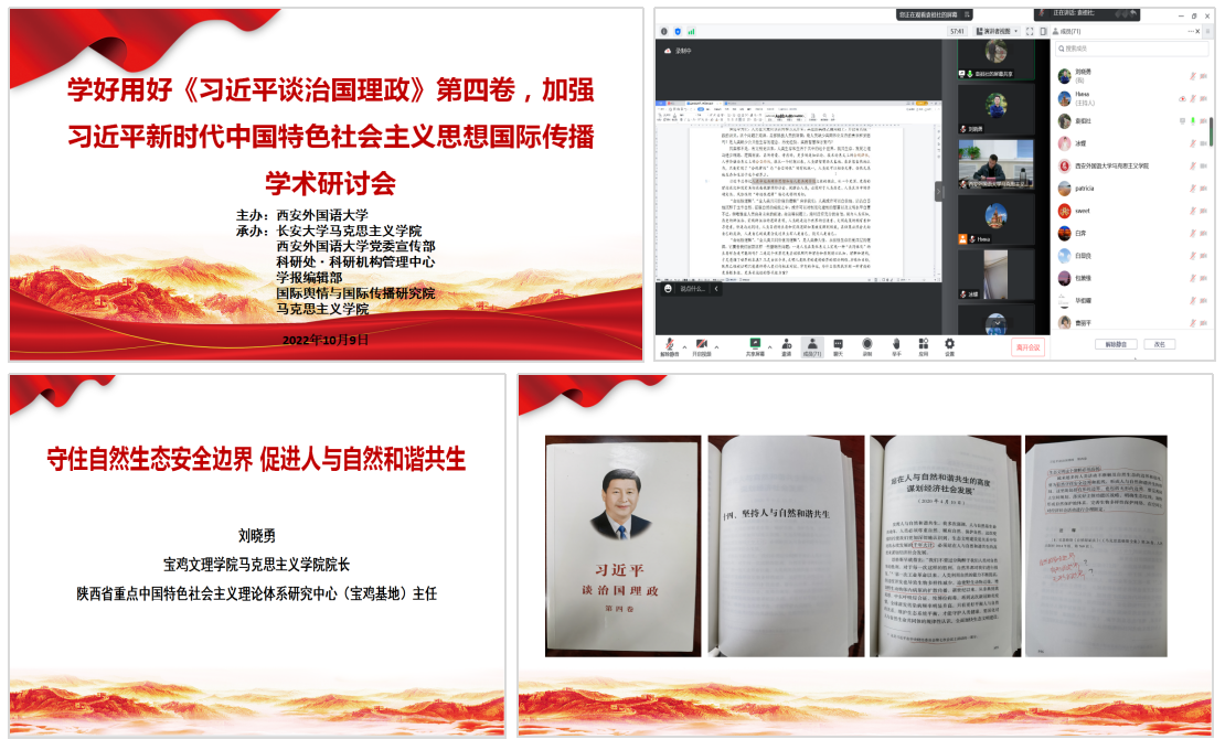 2022年10月9日,由西安外国语大学主办,长安大学好博体育和西安外国语大学好博体育、国际舆情与国际传播研究院等部门共同承办的“学好用好《习近平谈治国理政》第四卷,加强习近平新时代中国特色社会主义思想国际传播”学术研讨会在线上召开。陕西省委宣传部理论处处长高宝荣出席会议并致辞,中共中央编译局原秘书长、清华大学好博体育教授杨金海以及来自复旦大学、东北大学、西北大学等省内外的70余位专家学者参加了会议。好博体育经理、陕西省重点中国特色社会主义理论体系研究中心(宝鸡基地)主任刘晓勇应邀参加,并作了题目为《守住自然生态安全边界 促进人与自然和谐共生》的主题发言。