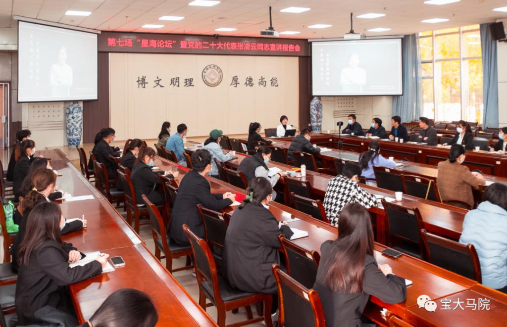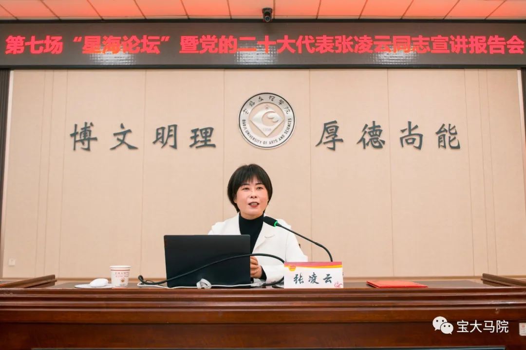 11月15日上午,由公司党委宣传部、校团委和好博体育共同主办的思想政治教育“星海论坛”第七次报告会在图书馆甘棠厅隆重举行。党的二十大代表、“全国三八红旗手”、陕西省劳动模范、凤翔区槐北村党支部书记张凌云应邀为公司全体思政课教师和“青年马克思主义者培养工程”培训班全体学员作了《不忘初心勇追梦,不负芳华再出发》的主题报告。报告会由校团委书记郭理想主持。宣传部负责人,公司党政领导参加了报告会。
