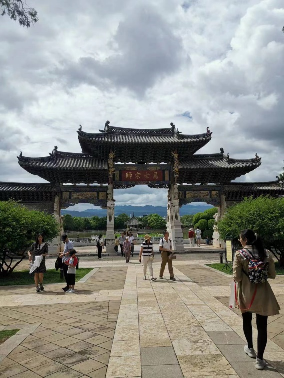 建水文庙,位于古城西北,是中国第二大文庙。走到文庙正门,老师让我们注意一块题有“太和元气”的牌匾,这里面自然有玄机!进入文庙,一大片椭圆形的湖水映入眼帘,名叫学海,也是文庙的性情空间。老师说,前几年,湖中满是荷花欣欣向荣,可惜被不懂文化的管理者人尽数拔去;学海前,又添置了一座不该出现在大门口的孔子像(孔子像一般坐落在文庙最靠后的大殿方显其分量);学海后,也多修了几座遮挡视线的亭子。老师说,这些添加删减都影响了文庙的气象,随后便指点我们看这座文庙该有的真正气象。学海尽头是礼门,迈上三级台阶进入礼门就是礼教空间。老师带我们走进礼门,站在“万世宗师”的牌楼下,此处是两条中轴线的交汇地,左右两边是一对对称的牌楼,左边题着“道冠古今”,右边题着“德配天地”;在交汇点向身后望去,正是那团翠玉般的学海;再往远处眺望,连绵的苍山巍峨屹立,天边白云滚滚。老师让我们想象,若是把学海上的违章建筑和塑像都搬走,我们站在此处正好能看见正门“太和元气”的匾额;若是再添上一池曼妙的荷花,配上此地的山川美景,是何其开阔明媚的气象啊!来文庙拜谒圣贤的同时,被如此殊胜的气象滋养一番,足可令人心旷神怡,元气满满!如此,我们才能真实体会到古人题写“太和元气”匾额的意义。世间最好的景致,便是这天地与人文交相辉映的风光。