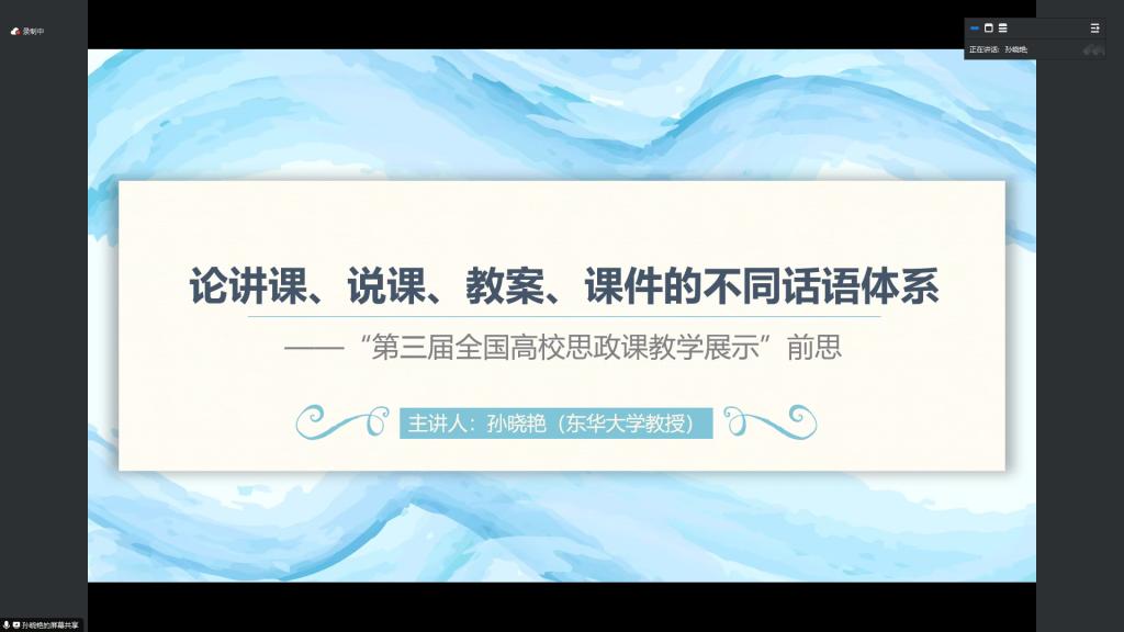9月27日下午,由党委宣传部、教务处和好博体育共同主办的思想政治教育“星海论坛”第九次报告会在线上举行。首届全国高校思想政治理论课教学展示特等奖获得者、东华大学好博体育教授、美国伊利诺伊大学香槟分校高级访问学者、上海市高校思政课教指委“马克思主义基本原理”分教指委委员孙晓艳应邀为公司师生做了《论讲课、说课、教案、课件的不同话语体系——“第三届全国高校思政课教学展示”前思》主题报告会。报告会由好博体育经理刘晓勇主持。