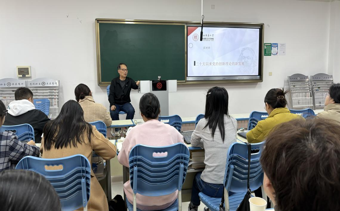 阎树群教授紧密结合时代形势,以“为什么要继续学习新思想”导入,从新思想的新发展阶段、新思想科学体系和精髓要义的新概括、新思想的新定位以及新思想的原创性贡献四个方面,对二十大以来党的创新理论进行了系统梳理阐释。阎教授依据权威文献资料,立足现实、旁征博引、生动风趣地分析了习近平新时代中国特色社会主义思想作为当代马克思主义、二十一世纪马克思主义,中华文化和中国精神的时代精华的核心内涵;“十个明确”“十四个坚持”“十三方面成就”“六个必须坚持”及其之间的相互关系;持续推进“两个结合”,不断实现理论创新的关键环节等。最后,阎教授叮嘱研究生:“‘水之积也不厚,则其负大舟也无力’,身为马院学子要坚持读原著、学原文、悟原理,学术研究要沉下心,坐的住板凳,这样理论根基才能扎实稳固。”阎树群教授还与在场师生进行了深入交流探讨。