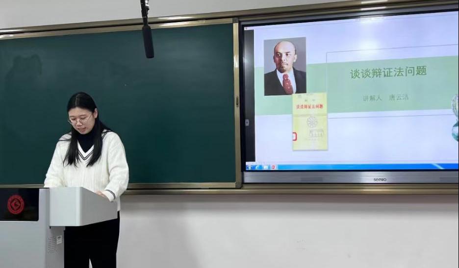 文本解读环节,唐云洁同学围绕《谈谈辩证法问题》的写作背景、中心思想、段落主旨、原理阐述以及当代意义五个方面对该文章进行了比较全面的解读。