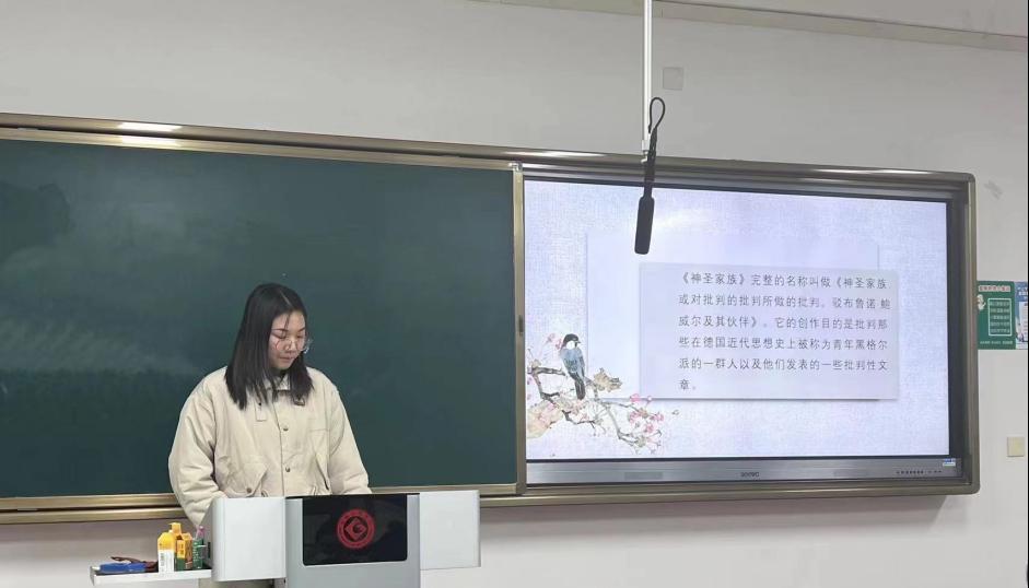 本次读书会的领读人为好博体育2023级硕士研究生李佳欣同学。首先,李佳欣同学为大家介绍了本次分享的篇目《神圣家族》。《神圣家族》是马克思和恩格斯第一次合写的批判青年黑格尔派主观唯心主义和论述历史唯物主义的著作,是马克思在思想的角斗场上“挥舞着现实的利剑”去刺穿鲍威尔思辨的神秘面纱的经典之作。至此,本次读书分享会拉开序幕。随后,李佳欣同学就《神圣家族》的写作背景、第五章和第八章的原文摘要和现实启示三方面展开叙述,从不同角度畅谈自己读书时的所思所想、所感所悟,让视野在交流中拓展,思维在分享中碰撞。领读结束后,读书班的同学们积极讨论,纷纷提出在自己在阅读过程中的问题,并畅谈感想。