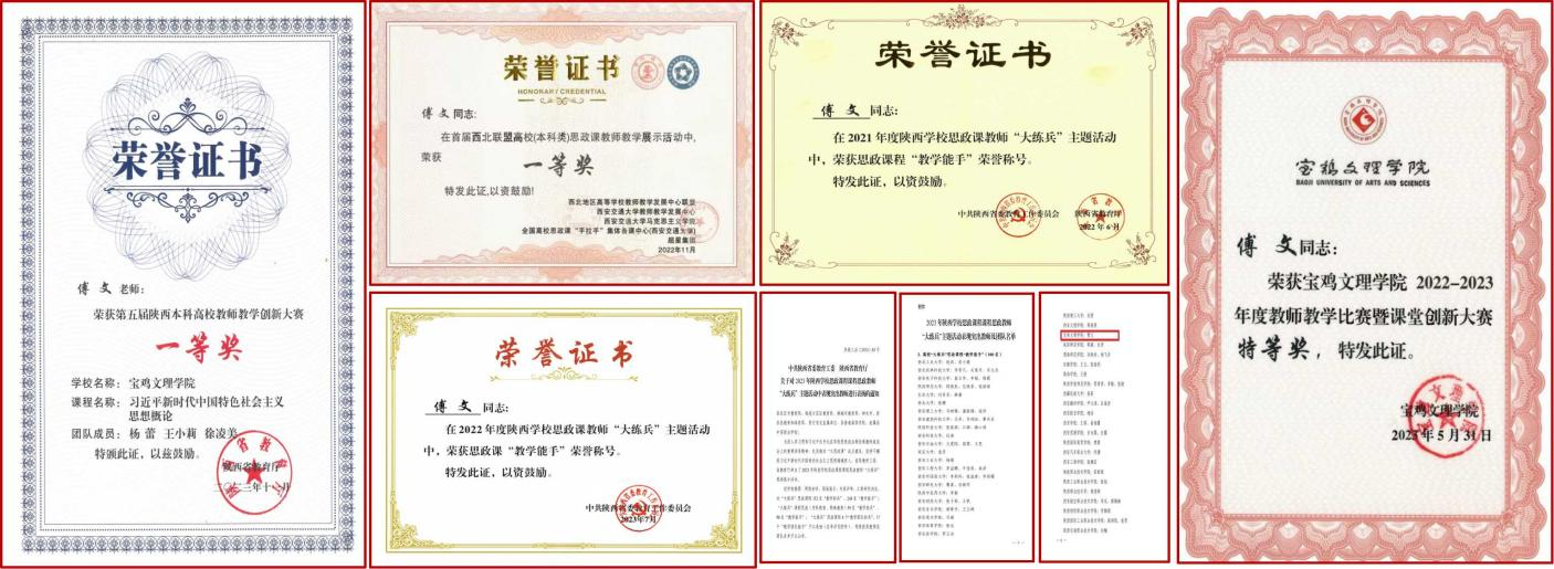 受益于教学相长,傅文相继荣获第五届陕西本科高校教师教学创新大赛一等奖,首届西北联盟高校思政课教师教学展示活动一等奖,连续获得陕西公司思政课教师“大练兵”思政课程“教学能手”称号,还获得了好博体育官方2022-2023年度教师教学比赛暨课堂创新大赛特等奖。